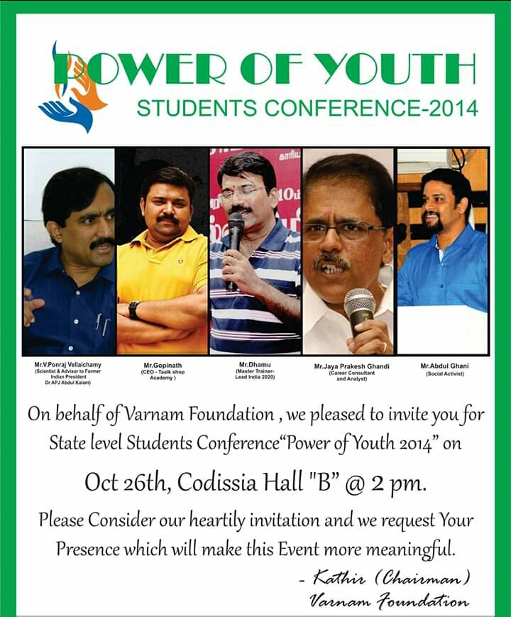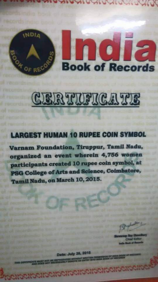 Varnam made a creative social awareness event by forming largest 10Rs coin symbol , in event each students event given 10Rs to help government school students & their important need for education. Event held in PSG college coimbatore, This event news is published in Dina Karan NEWS paper